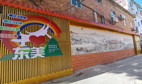 文明创建 绘就多彩画卷 为树立新时代文明实践宣言和承诺,东美社区先后完成片区内“时代文明小巷”的占道围挡清除、路面修补、墙面修护、线路整理、排水沟和下水道清淤修建、街巷绿化美化等工程,对背街小巷进行全面改造提升。为满足居民精神生活需要,社区增设文化长廊,让一面面原本单调的墙壁有了灵气,变成美观又会“说话”的文化墙面,打造成富有时代特色的文明小巷。