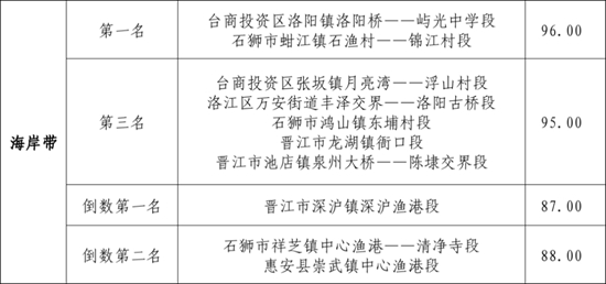 惠安县乡镇道路(螺阳)、晋江市乡镇道路(青阳)、德化县S215(浔中—赤水)等44段受评路段日常保洁管理到位、路面整洁有序,考评成绩在90分以上。部分道路受评情况不理想,一是巡回保洁不及时、不到位,垃圾、废弃物未清理问题多,整体感观欠佳;二是市容市貌整治不够深入,垃圾收集桶周边地面脏污、“牛皮癣”未清理、废水乱排放、废品收购站未规范围挡、广告幅及店招破损等问题,如石狮市乡镇道路(宝盖)、永春县乡镇道路(岵山)、晋江市乡镇道路等。 海岸带考评情况