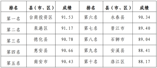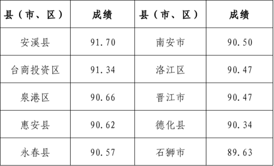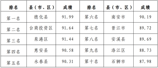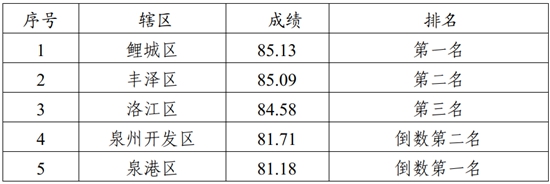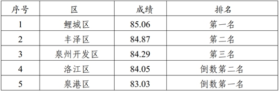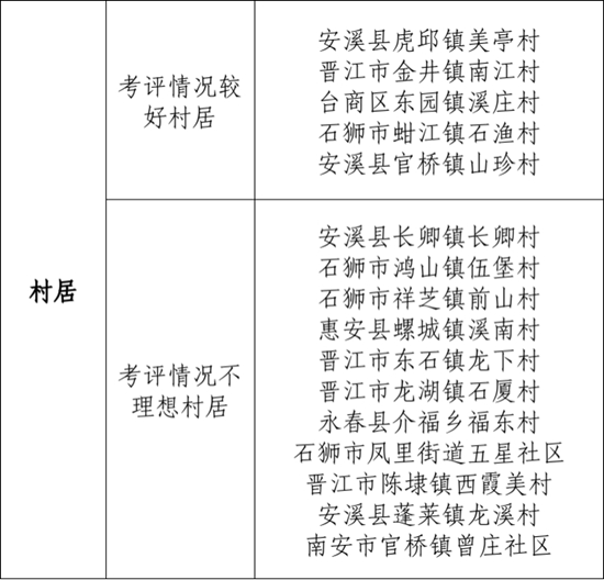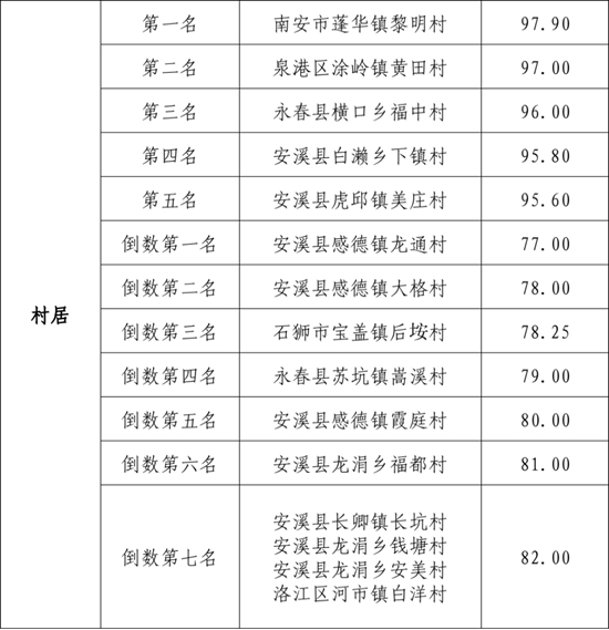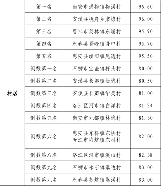 各地结合防抗台风工作部署,持续强化责任落实,多举措推动环境卫生、村容村貌综合治理,扎实推进城乡人居环境管理,为台风防范工作和灾后抢险恢复工作奠定了良好、坚实的环境基础。泉州台商投资区以“串点成线、连线成片、集片成面”的工作思路,积极发动、全面铺开,持续开展人居环境综合整治,本月成绩居首。泉港区齐抓共管,抓实抓细,不断完善制度化建设,持续问题导向、源头治理,人居环境水平提升明显,成绩较好。德化县县、镇、村共同建立长效巡查机制,坚持奖优罚劣,压实县、镇、村各级责任,扎实推进城乡品质提升,成绩排名靠前。个别县(市、区)、乡镇整治工作开展情况不理想,其中洛江区部分镇、村管理上有所松懈,厂区周边、边坡空地、闲置征地、镇村交界处等区域管理力度不足,卫生状况差,市容秩序不理想。安溪县部分村居人居环境长效管护机制仍待完善,问题整改力度还不够,环境卫生死角盲区仍不少,整体村容村貌改观不够显著。 村居考评情况