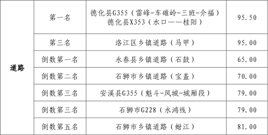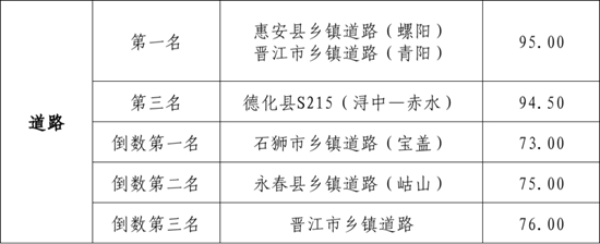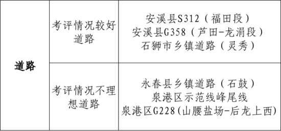 大部分受评的村居总体情况良好,安溪县虎邱镇美亭村、官桥镇山珍村、晋江市金井镇南江村、台商区东园镇溪庄村、石狮市蚶江镇石渔村等村居总体村容村貌整洁有序,房前屋后保洁到位。主要不足有:一是部分村居人居环境整治仍有盲区,日常保洁监管机制仍待完善,未能做到全域保洁,房前屋后、庭院周边垃圾、废弃物清理不到位,如安溪县长卿镇长卿村环境卫生管理不到位,保洁范围不够全面,房前屋后垃圾积存,垃圾桶周边地面积污渍;石狮市祥芝镇前山村工厂周边建筑垃圾偷倒严重,工业区保洁效果差,各类卫生问题多;惠安县螺城镇溪南村村道两侧建筑垃圾偷倒问题较为突出;晋江市东石镇龙下村河沟、空地等管理薄弱,垃圾散落多。二是村容村貌长效化治理工作不扎实,主要是垃圾收集桶及其周边路面脏污、“牛皮癣”未清理、家禽未圈养等问题整治效果不理想,“回潮”快,如石狮市鸿山镇伍堡村沿街垃圾桶周边脏乱差,餐饮店油烟乱排放,整体观感较差。 道路考评情况