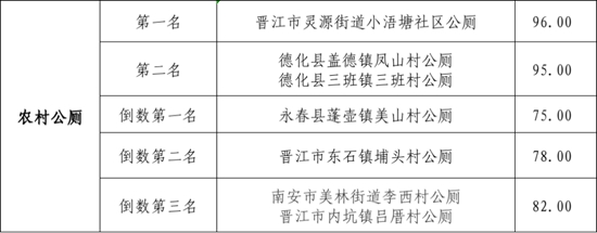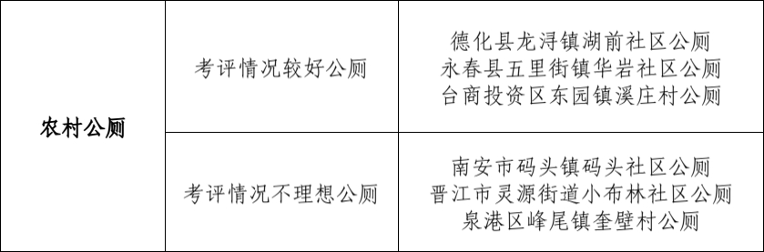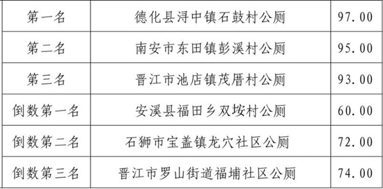 石狮市鸿山镇东埔村段和蚶江镇石渔村——锦江村、晋江市深沪湾海底古森林保护区和东石镇非重点段等海岸带市容秩序良好,环境卫生整洁,位居前三。部分海岸带受评情况不理想,如石狮市永宁镇红塔湾浴场—黄金海岸段、泉港区界山镇枫慈溪入海口——潘南盐场段沙滩沿途生活垃圾较多,整体感观欠佳,成绩靠后。 农村公厕考评情况