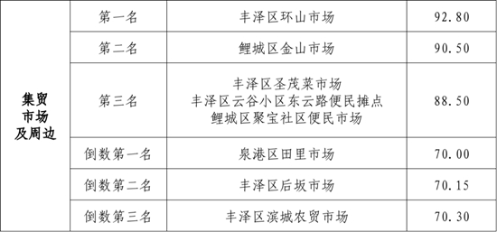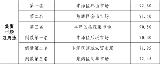 90分段14座,80分段55座,70分段13座,低于70分4座,考评成绩在80分段居多,其中丰泽区法石社区菜市场公厕、泉港区锦绣街公厕、鲤城区向阳公厕等成绩靠前,部分公厕精细化管理仍不足。一是环境卫生保洁和厕容秩序管理质量不高,保洁不到位、地面和设施设备脏污、厕内保洁工具暴露等问题突出;二是设施设备维护管理不够及时,部分公厕设施设备老旧损坏;三是人性化服务质量不高,部分公厕未铺设防滑垫、未设置防蝇设施,未及时补充洗手液、厕纸等问题较为普遍;四是公厕周边卫生责任区域管理薄弱,保洁不到位、垃圾未及时清理、杂物乱堆放占用公共空间等问题较为突出。如丰泽区凤屿社区村间东宫公厕、洛江区万盛街农贸市场边公厕、鲤城区高山社区山中巷公厕。 集贸市场项目