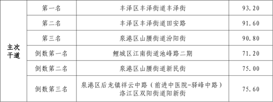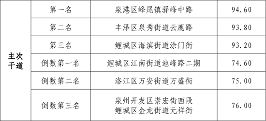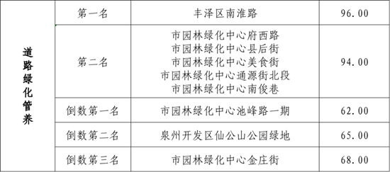 鲤城区金山市场、丰泽区圣茂菜市场卫生保洁到位、秩序良好。从考评情况来看,中心城区农贸市场在精细化管理上仍有不足,市场出入口未公示当天蔬菜农药残留检测结果,猪肉摊未公示当日检验检疫证,越摊经营、杂物乱堆放普遍,熟食摊“三防”“三戴”落实不到位,个别市场存在车辆入场。农贸市场周边零散垃圾多,地面清洗不及时、不到位,市容秩序管理不严,占道经营、杂物乱堆放等问题多,部分市场公厕未实时保洁,配套设施不齐全,服务用品补充不及时,如丰泽区法石市场、鲤城区南菜市场和果蔬批发市场。 市直单位项目考评成绩 主次干道项目市公路事业发展中心直属分中心81分;集贸市场项目泉州市城镇集体工业联合社87.1分;主次干道绿化管养项目市园林绿化中心82.38分;公园项目市城市森林公园发展中心95.75分、市清源山管委会94分、市公园中心93.13分、市西北洋滞洪排涝中心92.5分;重点水系环境卫生项目市城建集团91.5分、市市政工程中心91.5分、泉州师范学院68分。 道路绿化管养专项考评情况