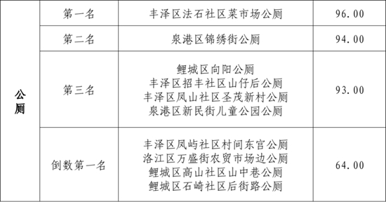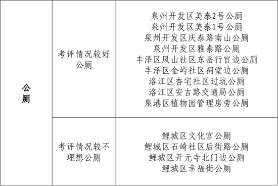 鲤城区海滨街道涂门社区、临江街道新桥社区和开元街道东北社区等卫生保洁到位、秩序良好,考评成绩达90分以上,另外社区80分区间46个,70分区间39个。但部分社区存在路面脏污、积浮土问题,部分历史督办对象长效机制不健全,卫生问题“回潮”快,城中村民房周边杂物乱堆放现象未全面有效整治,房前屋后保洁不理想,环卫作业质量未有效提升,如泉港区山腰街道锦祥社区、丰泽区清源街道西宝社区、鲤城区常泰街道下店社区,治理不到位成绩靠后。 公厕项目