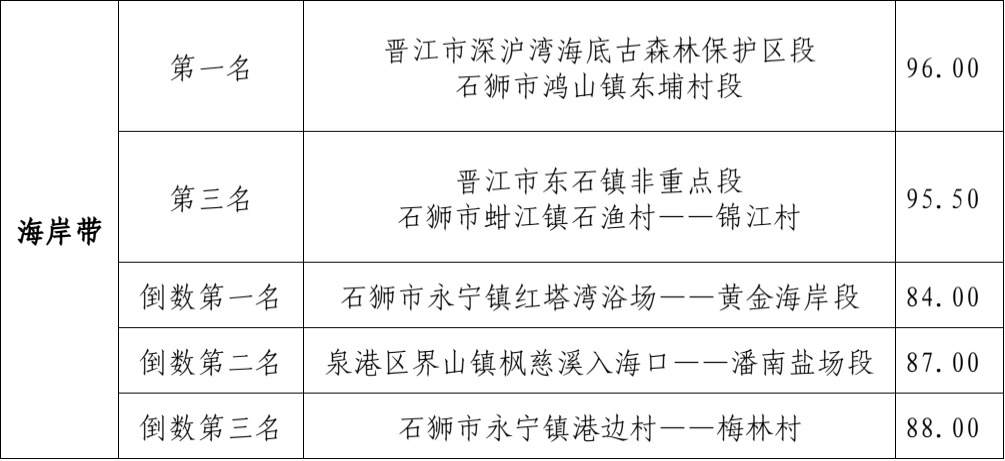 德化县G355(雷峰-车碓岭-三班-介福)、X353(水口—桂阳)、洛江区乡镇道路(马甲)等受评路段日常保洁管理到位、路面整洁有序,考评成绩靠前。部分道路受评情况不理想,一是巡回保洁不及时、不到位,垃圾、废弃物未清理问题多,整体感观欠佳,其中永春县乡镇道路(石鼓)道路巡回保洁工作缺位,垃圾四处散落,总体观感差,成绩居末位;石狮市乡镇道路(宝盖)路侧空地偷倒垃圾问题明显,垃圾收集点周边地面脏污明显,观感较差。二是市容市貌整治不够深入,垃圾收集桶周边地面脏污、“牛皮癣”未清理、废水乱排放、废品收购站未规范围挡、广告幅及店招破损等问题,如石狮市乡镇道路(蚶江)沿途地面脏污问题突出,部分公共设施破损未及时更换。 海岸带考评情况