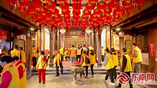 千名信众聚集在古城。通淮关岳庙 供图 东南网11月19日讯(本网记者 施远圻)11月19日凌晨,晋江永和钱仓忠义庙信众约1200人组团到鲤城区,参访泉州通淮关岳庙,表达对关公精神的敬仰和崇拜。 据了解,作为闽南地区最负盛名的民间信仰活动场所之一,泉州通淮关岳庙是海内外、东南亚以及我国港澳台地区600多间关帝庙的祖庙。今年8月份起,泉州通淮关岳庙通过“分灵认证”的形式将把一脉相承的香火之缘聚拢在一起,架起各分灵庙之间的友谊桥梁,共同传承发扬关公文化、践行“忠义仁勇礼智信”的关公精神。 晋江永和钱仓忠义庙便是首批认证的26家国内分灵庙宫庙之一,此次凌晨到通淮关岳庙谒祖进香,便是分灵认证后的首次大规模活动。“我们因‘关公信仰’齐聚古城,古城的夜晚因我们而热闹,我们也见到古城不一样的美。”来自晋江的信众说道。