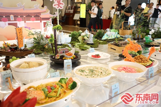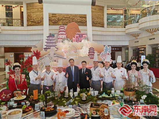 活动现场,展示各色美食。东南网记者 施远圻 摄 整个宴席贯穿泉州古城发展演变的历史,融合了衣冠南渡、中原遗风、泉州开埠、番商云集、向海图强、勇闯南洋等多个时期、时代的特色饮食文化,共有22道菜品,包括8道前菜、10道主菜、4道主食及甜品,在食材、调料、搭配、口味等方面,则集中原文化、闽越文化、海洋文化、南洋文化为一体,遵循前菜起幕、热菜高潮、主食过渡、汤羹转润、点心精致、甜汤合尾、水果上新的上菜顺序,力求实现味蕾上的起承转合,让食客在“舌尖”感受泉州深厚的历史文化底蕴。 “‘刺桐宴’菜品由鲤城区商务局组织策划,由我们泉州酒店承办制作。”泉州酒店餐饮总监郑书华介绍,菜品最大特点是保留了食材的原汁原味,在制作、搭配、调料等方面融合多元风味,造就韵味独特的古城美食。 一席美味,雅致千年。“刺桐宴”由泉州市申创“世界美食之都”工作专班、泉州市商务局、鲤城区人民政府指导,泉州文旅集团、鲤城区商务局主办,旨在进一步传承和发展鲤城美食文化,推动打造泉州美食文化名片,助力泉州市申创“世界美食之都”。