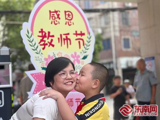 泉州市第二中心小学校门口,孩子给老师送上一个吻。学校 供图 而这正是学校与孩子们“有计划”地为全体老师送上的一份仪式感。孩子们早早到校,手持自制贺卡,分列两旁形成一条温馨的“花路”。每当老师步入校门,他们便以最真诚的笑脸、最响亮的掌声表达敬意与爱意。有的老师一开始略显惊讶,随即笑意漾开;有的俯身接过孩子们的卡片,眼里满是欣喜与感动。 “节前就知道学校和学生们要给我们惊喜,哪怕有心理准备,当走进学校那一刻还是很感动、很温暖。”该校二年级语文教师郑月明告诉记者,从教三十余年来,苦过、累过、但从未后悔过,她很高兴自己是一名人民教师,让她长期与孩子们的欢声笑语为伴,保持着一颗童心。