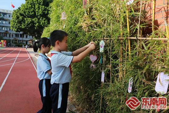 泉州市通政中心小学孩子们将写满祝福的书签挂在竹枝上。学校 供图 绿色过节 竹枝挂卡铭师恩 “我们感谢老师这六年对我们的教育,祝老师节日快乐,幸福安康!”“小鸟感谢天空,给予它们飞行的勇气;大树感谢土壤,为它们提供养分;我们感谢老师,给予爱与知识。”……一大早,泉州市通政中心小学六年级学生苏心元和张梓妍将亲手书写的祝福卡挂进校园小竹林。工整俊逸的字迹,载满真挚的感恩。