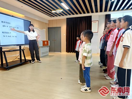 鲤城区第五实验小学闽南童谣兴趣小组学生们,温习与教师节相关的闽南语。学校 供图 |