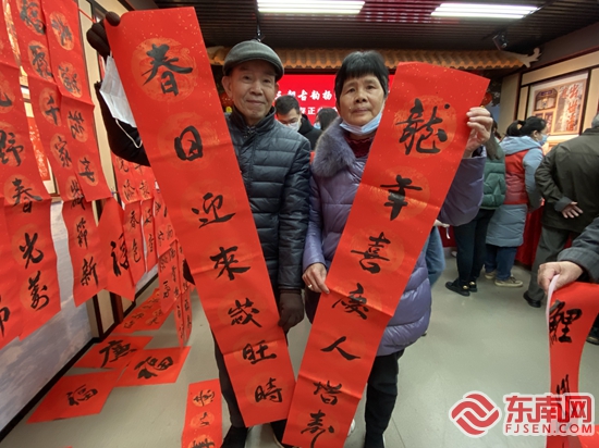 傅子招夫妇展示挑选到的春联。陈梓昕 摄 在悬挂春联的位置前,有对老夫妇小心翼翼地用纸巾沾吸着春联上未风干的墨迹,仿佛在擦拭着珍宝一般。他们住在鲤中街道井亭巷附近,喜欢手写春联的他们早早地来活动现场,并挑选了好几副春联。其中一副春联为“龙年喜庆人增寿 春日迎来岁旺时”,他们打算把这副春联贴在大门口。“我今年81岁、老伴也74岁了,这副春联寓意很好,希望我们老两口新的一年身体能继续健健康康。”傅子招告诉记者,送春联送的的不仅仅是一幅泼墨红纸,更是对新年新气象的希冀与憧憬,传递满满的幸福感。 值得一提的是,此次活动所书写的春联内容也更加多样化,除了有喜庆的龙年主题春联、泉州特色主题春联,还有富有教育意义的孝廉主题春联、税务主题春联。书法家朱雅宣一个上午便写了近50副春联,用自己擅长的书法为大家送祝福,她感觉很开心。从2009年起,每年春节前她都会参加书赠春联相关活动,喜庆的内容也让她越写越有精气神。 除了送春联,精彩的“快闪”表演也引得市民群众拍手叫好!闽南童谣《好家风 有福气》、琵琶演奏《万疆》、闽南四句快板《廉政听我说》……来自鲤城辖区各小学师生、相关部门干部职工轮番上台,通过节目提前向现场市民群众拜个早年。 _ueditor_page_break_tag_