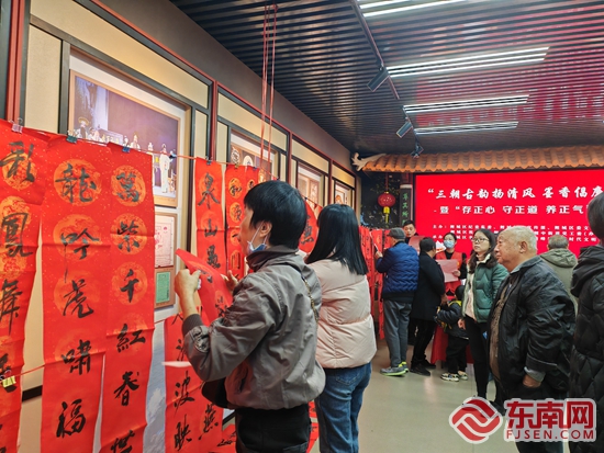 市民群众认真挑选心仪的春联。东南网记者 施远圻 摄 东南网1月23日讯(本网记者 施远圻 实习生 陈梓昕)“我们喜欢手写春联,贴在门上年味更浓……”今天上午,鲤城区“三朝古韵扬清风 墨香倡廉贺新年”暨“存正心 守正道 养正气”春联活动在三朝巷廉洁文化街区举行,为市民群众送去新春祝福和问候。 活动现场,来自鲤城区书法家协会的15位书法家挥毫泼墨、书赠春联,笔起笔落间,引来围观市民连连赞叹。成排的春联与“福”字、“廉”字整齐地悬挂着,任时间风干墨迹,市民轻轻执卷赏阅品读,挑选心仪的春联。贴心的书法家们还为居民提供“独家定制服务”,帮他们书写喜欢的春联。 _ueditor_page_break_tag_