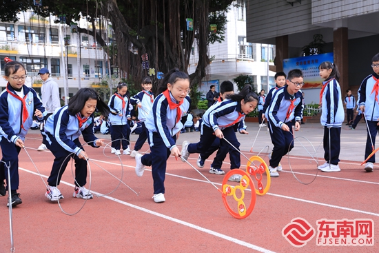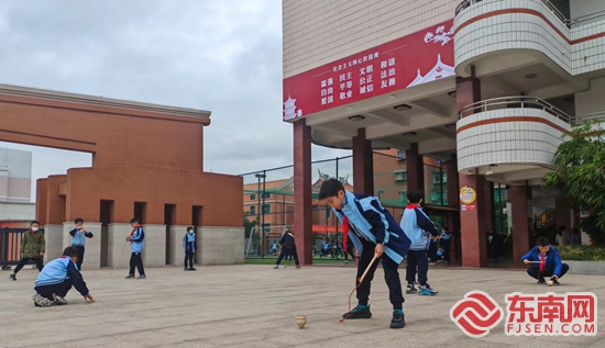 天气虽然寒冷,仍挡不住孩子们玩耍的热情。东南网记者 施远圻 摄 _ueditor_page_break_tag_设置20个项目 师生们一起玩游戏 师生比赛抽陀螺、学生教老师滚铁环、师生一起玩丢手绢……这段时间,在学校的操场上、走廊内,总能看到这样的画面,孩子们带着老师玩,老师们跟着孩子学。20个项目,让师生们玩得不亦乐乎。 “我们把陀螺、毽子、铁环、沙包等器材放在学校的固定区域内,方便学生在下课后自行取用。为了保障孩子们的安全,每到课间休息还安排老师们轮流到各区域‘站岗’,孩子们遇到不懂得玩的器具,可以向老师询问,老师也可以参与到游戏中。”学校体育教师李瑞芳告诉记者。