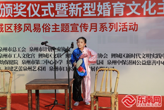 答嘴鼓《着听老人话》。李淑媚 摄 有趣的方言小品、曲调悠扬的南音表演、诙谐风趣的答嘴鼓表演……主办方精心准备了多个节目,让市民群众感受传统文化的魅力。其中来自泉州市第二中心小学林紫烨同学带来的答嘴鼓《着听老人话》还曾荣获第五届福建省曲艺丹桂奖少儿大赛二等奖,该作品由一人分饰两角,用闽南俗语演绎小女孩听老婆婆讲述做人、做事、明道理的故事,传递出尊老爱老的传统美德。 下一步,鲤城区将充分发挥世遗古城核心地带区位优势,深入开展群众性主题宣传活动,组织发动群众创作形式灵活、易于传唱的“闽南四句”“三句半”、快板、说唱短视频、闽南童谣等文艺作品,全方位、多角度展示新型婚育文化,推动新型婚育文化走向基层群众、走进千家万户,营造生育友好的社会环境。 _ueditor_page_break_tag_