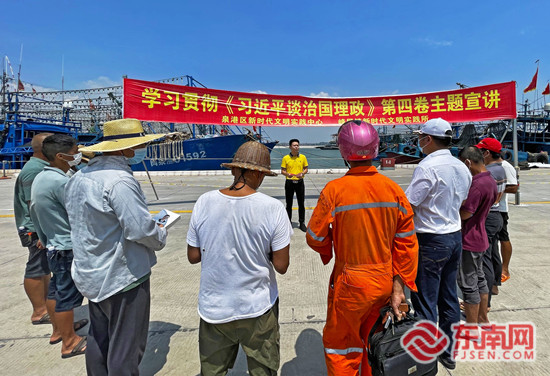 当地渔船宣讲小分队成员正在为渔民党员开展宣讲。郭菲凡 摄 东南网8月16日讯(通讯员 郭菲凡 林育君 本网记者 黄雨昕)眼下正是伏季休渔期,对渔民党员来说正是补足思想之钙、筑牢精神港湾的好时机。近日,泉港区利用休渔期间“船在港,人在家”的良好契机,送学进渔港、上码头,组织开展学习贯彻《习近平谈治国理政》第四卷主题宣讲活动。 在位于泉港区峰尾镇诚峰国家一级渔港的码头上,不时传出阵阵掌声,当地渔船宣讲小分队成员正在为渔民党员开展宣讲。 “以习近平同志为核心的党中央统筹疫情防控和经济社会发展,团结带领全党全国各族人民如期打赢脱贫攻坚战,如期全面建成小康社会,为促进共同富裕创造了良好条件……”宣讲现场,泉港区峰尾镇党委书记庄向阳结合渔民生产生活实际,深入浅出带领渔民学习重要论述,为渔民们注入新的思想内涵和理论营养。 “这样的宣讲来得很及时,让我们备受鼓舞,对未来发展更有信心了。”现场一名聆听宣讲的渔民说道。 宣讲接地气,理论入人心。今年以来,泉港区着力构建新时代文明实践“中心、所、站”三级联动的理论宣讲体系,策划实施“一镇一品”“百村百站”“千场万人”宣讲活动,有力确保宣讲队伍多样化、内容精准化、对象分众化,在理论传播中不断增强群众向心力、凝聚力,汇聚起新时代新征程上团结奋斗、勇毅前行的磅礴力量。 |