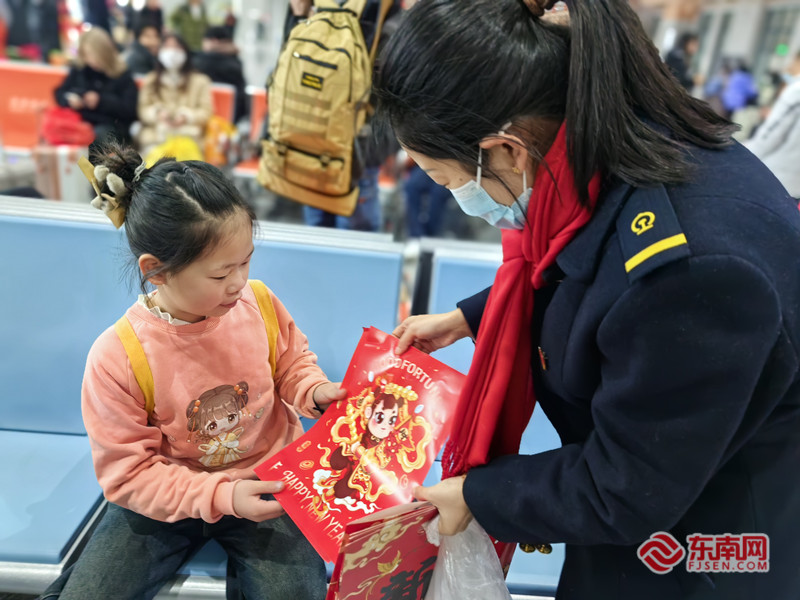 铁路工作人员向旅客赠送春联。东南网记者 谢玉妹 摄 |