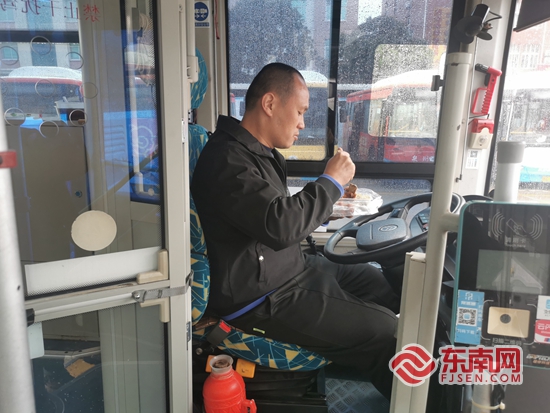 利用工作间隙吃午饭的公交车驾驶员。泉州市交通运输局 供图 _ueditor_page_break_tag_