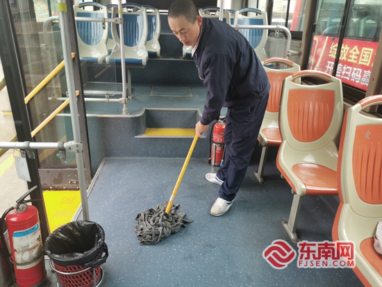 驾驶员正在对其所驾驶的公交车进行清洁,给乘客更好的乘坐体验感。泉州市交通运输局 供图 _ueditor_page_break_tag_
