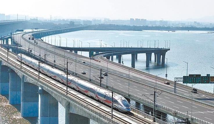 跨海大桥上 高铁与汽车“赛跑” 网友感叹:好可爱的春运图景