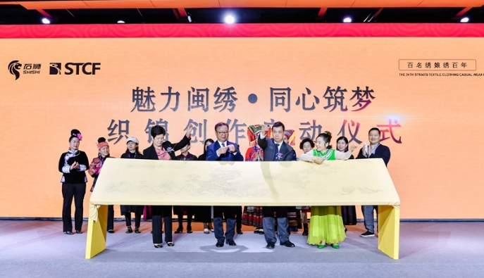 与会领导和嘉宾海共同为“魅力闽绣·同心筑梦”织锦作品牵针引线,绣上第一针。石狮宣传部 供图