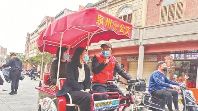 泉州古厝门楣上的“衍派”“传芳”是什么意思?闽南红砖古厝的建造工艺上有什么独特之处?对此想必很多人知之甚少,但泉州公交公司54岁的三轮车驾驶员洪志强对此却如数家珍,好似行走的活字典。作为“小红”队伍中唯一的一名古城讲解员,他每天与来自五湖四海的乘客打交道,在迎来送往中推介泉州古城文化。