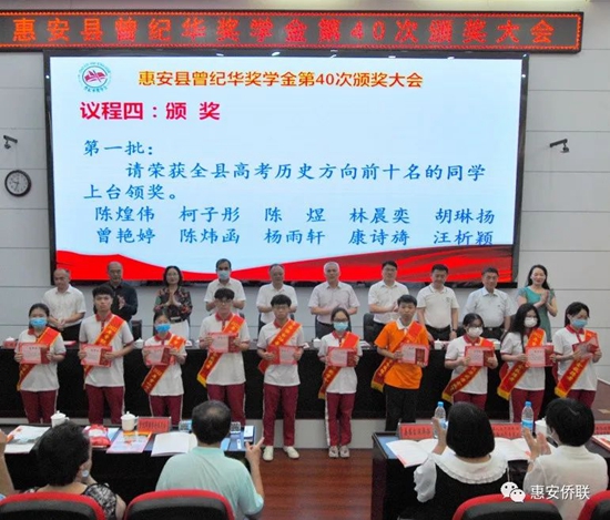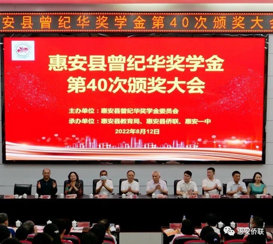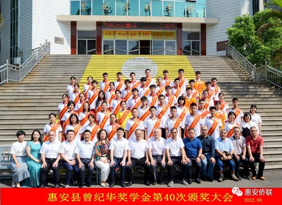 春华秋实,硕果丰盈。8月12日,曾纪华奖学金第40次颁奖典礼在惠安一中举行。县委常委、统战部部长周鹏飞,县人大副主任黄育聪、副县长郭惠卿、县政协副主席潘丽萍,统战部常务副部长(侨办主任)王德法、教育局局长陈加龙、侨联主席康惠兰,曾纪华奖学金委员会代表曾昭冲先生等相关部门领导、嘉宾出席了颁奖典礼。 曾纪华奖学金第40次颁奖典礼,共颁发14.6万元奖学金,50名获奖学生上台领奖,其中高考学子30名,中考学子20名。 郭惠卿副县长代表县委、县政府对获奖学生表示祝贺,对曾文能先生(曾纪华先生之子)以及长期关心支持教育事业的港澳台同胞、海外侨胞情系桑梓、惠泽教育的爱心善举表示感谢。他表示,曾纪华奖学金将继续引领和激发着更多的社会力量扶教兴学,对进一步营造尊师重教、关心教育的社会氛围,具有极其重要而深远的意义。同时希望同学们以曾纪华老先生为榜样,无论今后走到哪里,都要关心支持家乡的各项事业,积极为家乡科学发展、贡献力量,为谱写惠安未来蓝图添砖加瓦。