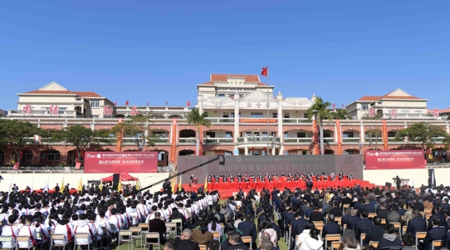 荷山中学学生代表献词。荷山中学 供图 华诞逢盛世,侨校聚英贤。当天,海内外的荷山学校校友们以现场参与、线上祝福的方式共同为母校走过百年办学的峥嵘岁月庆贺。 “百年荷校取得的辉煌,是源于党和政府的领导和关心、源于校主刘玉水先生爱国爱乡、倾资办学,源于海外侨亲、校董校友、乡贤心系荷园,倾情助学。”荷山学校校友总会会长庄晏成表示,荷山学校广大校友将饮水思源,继承校主刘玉水先生的办学理念,感恩母校、情系母校,尽心尽力支持母校建设发展。同时,牢记“慎毅”校训,努力在各自领域里作出更大贡献,为母校争光添彩。 凝心聚力谋发展,侨乡名校再出发。活动现场,荷山中学校长张伟清表示,全体荷山人将牢记“慎毅”校训,弘扬校主倾资办学、校友倾情助学、教师倾心教学、学生倾力苦学的荷山“四倾”精神,坚守教育初心,牢记育人使命,全力争创福建省示范性高中,勇当惠安教育事业高质量发展的主力军,不断推动荷山学校各项事业跨越发展。 据了解,1922年,荷山学校校主刘玉水先生受爱国华侨领袖陈嘉庚先生教育报国思想的启发和影响,毅然回乡改造荷山旧式私塾为新式学堂,把学校命名为“荷山学校”,开启了荷山学校百年办学的光辉历程。刘玉水先生一生艰苦奋斗,一生倾资兴学,一生忠贞爱国,手定“慎毅”校训,从而留给荷山学校取之不尽、用之不竭的巨大精神财富。百年来,荷山“慎毅”校训和“四倾”精神铸就了荷山学校的独有精神特质,浸润了一代代荷山人的思想和言行,感召着一代代荷山人自强不息,薪火相传,志存高远、立志成才,回报社会。