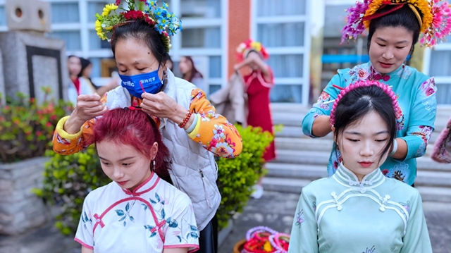 蟳埔簪花手艺人为学生簪花。东南网记者 谢玉妹 摄 东南网4月8日讯(本网记者 谢玉妹)8日上午,由泉州学研究所、泉州师范学院图书馆、图书馆党总支与华为天生会画联合举办的“刺桐印记,簪花技艺”真人图书馆活动在泉州师院图书馆举行。活动邀请了蟳埔簪花手艺人黄瞻作为“真人图书”,分享蟳埔簪花习俗,并现场为参加活动的师生们簪花。 据黄瞻介绍,簪花围始于宋代,一位生活在泉州的阿拉伯人,建了一个花园,园里有许多从西域引进的奇花异木。他经常将鲜花赠送给相邻的蟳埔女簪戴,于是渐成蟳埔女发髻簪花习俗。早期的蟳埔女从孩提起,就把头发留长,到十一、二岁将秀发盘于脑后,系上红头绳,梳成圆髻,然后再穿上一支“骨髻”,另用鲜花的花苞或花蕾串成花环,少则一、二环,多则四、五环,再以发髻为圆心,圈戴在脑后。自今年起,受明星效应影响,蟳埔簪花围体验日渐“火爆”,丰海路的蟳埔村开设了不少簪花围体验店。“我们平均盘一个头发要5-7分钟,男女老少都来体验过。”黄瞻认为,保留这样的蟳埔文化,体现的是泉州蟳埔女对美好生活的向往和共同的文化传承记忆。