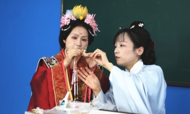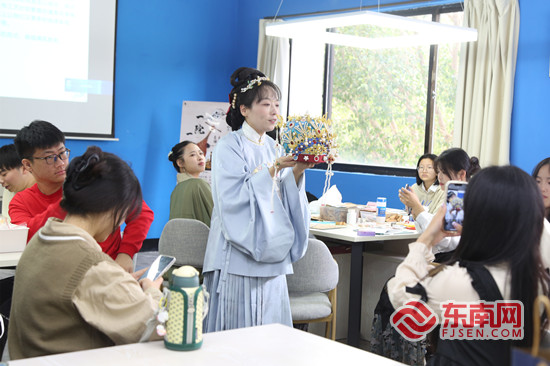 授课教师教授簪花。柯晓军 摄 东南网11月30日讯(通讯员 柯晓军 本网记者 谢玉妹)11月29日下午,一场别开生面的汉服、簪花DIY体验活动在仰恩大学举行。在人文学院的思政实践课上,《诗经选讲》《文创项目考察》两门课共同开展,现场衣袂飘飘,佩戴簪花的学子为师生带来穿越时空的传统文化盛宴。 当天,来自宁德鹿鸣汉文化工作室的专业人员吴筱婉、赖丽娜向同学们介绍了汉服内涵与发展历史,从汉服的礼制、汉服传播与影响、着汉服行古礼、佩戴簪花的习俗等方面介绍了中国汉服文化。在讲解的同时,同学们也穿着不同朝代的汉服进行示范,从商周到明末,汉服不同的特点、所包含的等级制度、礼仪文化随着历史的时间轴缓缓流淌而来,配合音乐、视频,课堂气氛热烈、生动形象。 现场,同学们还体验穿着汉服、DIY簪花。戴着自己亲手制作的头饰,文化创意实验班学生孙玉婷认为,簪花寄托着百姓对美好生活的向往并历经千年不衰,成为一种特定的民俗符号,在中国的审美文化中留下了深刻印记,成为中华优秀传统文化的一部分,“我们有义务守护、传承这些民俗文化。”