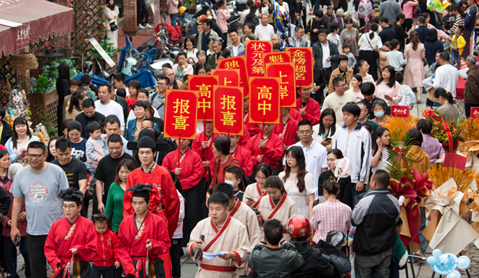 状元巡游现场。陈志鹏 摄 东南网5月4日报道(本网记者 施远圻)“我喜欢看状元巡游,很古风、很有仪式感。”“我很喜欢魁星宴,里面的永春美食很有特色。”……“五一”假期,在泉州市永春县五里古街上,这样的对话时常在市民、游客间发生。 原来,在这个假期,永春县以“魁星”文化为引,在五里古街推出“魁星”文化系列活动,让市民、游客看状元巡游、向魁星祈礼、敲状元鼓、品魁星宴,沉浸式打卡五里古街、了解“魁星”文化。长约590米的古街,假期日均客流量超4万人次。 活动寓意好 孩子期待学业有成 走进五里古街,只见街头两侧的“金榜题名”签名墙已密密麻麻签满了名字,市民、游客跟随状元巡游队伍一路往街中行走,会经过会元、解元、状元等三道门,直至五里古街魁星阁,向魁星祈礼。 状元巡游队伍中,除了俊美帅气的“状元郎”以及古风扮相的“家丁”们外,年龄不等的孩子们也是这支队伍的主角,他们一路跟随队伍行进,期待能沾到“好运气”。“状元郎”会不时停下来与孩子们玩“猜丁壳”“对古诗词”等互动游戏,游戏获胜者可收获寓意吉祥的“状元笔”。 家住永春县的苏巧玲女士得知五里古街有状元巡游活动,便带着女儿前来体验,害羞的女儿在她的鼓励以及周边小朋友的影响下,主动走入人群中与“状元郎”玩“猜丁壳”游戏。“巡游活动很好玩,我赢得‘状元笔’,接下去我会好好学习,希望将来能考上好大学。”今年11岁的梁雨辰小朋友告诉记者,感受到自己的进步,她也变得更加自信、大方。