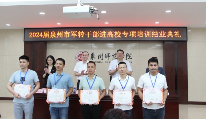 结业典礼现场 张钰琪 摄 东南网6月29日讯(本网记者 陈诗婷 实习生 张钰琪)28日上午,2024届泉州市军转干部进高校专项培训结业典礼在泉州师范学院举行,25名军转干部完成为期一学年的专项培训活动,学员代表领取结业证书,优秀学员领取荣誉证书。 “通过一年的学习,各位学员能够主动转变角色,把军人的优良作风带进校园、融入到学习中,在政治思想、专业素质和岗位能力等方面得到了加强和提升。”泉州师范学院党委常委、副校长夏侯建兵在致辞中表示,希望学员要坚持学习,通过不断学习努力增强本领;要实干笃行,在地方履职中建功立业;同时,也希望学员共同关心母校,一如既往支持母校发展。