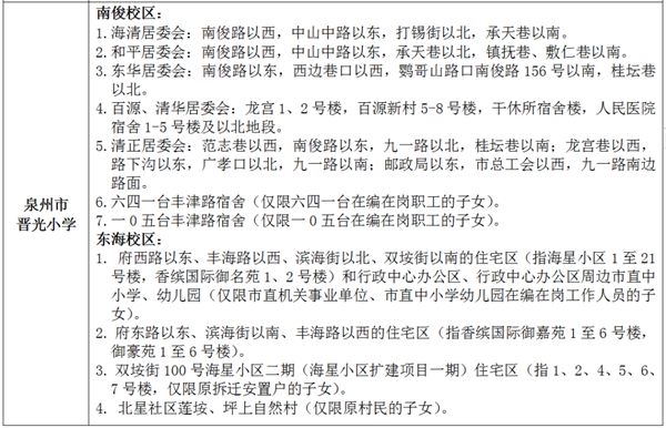 日前,2022年秋季泉州市直小学、幼儿园招生工作实施意见出台,比去年提早出台了约1个月。今年市直小学计划招收1600名一年级新生,市直幼儿园计划招收1182名小班幼儿,各校招生服务范围与去年总体相同,招生办法在延续去年政策的基础上,有作进一步细化和明确。 市直小学 招生计划和招生服务范围 与去年总体相同 各市直小学招生计划如下:泉州市实验小学:300人;泉州师范学院附属小学:450人;泉州市晋光小学:650人(南俊校区250人、东海校区400人);泉州市第二实验小学:200人。 各市直小学的招生服务范围如下: 招生办法与去年相比 有作进一步细化和调整 总体上是按照2022年2月16日出台的《泉州市教育局关于2022年秋季中心市区小学招生入学工作的实施意见》(泉教初〔2022〕1号)精神,综合近年来市直小学招生文件内容,进行细化和调整。 (一)市直小学优先招收的对象和具体条件 1. 各市直小学优先招收本校招生服务区域内户籍、住房产权、实际居住“三一致”家庭的适龄儿童(简称“三一致”对象)及按国家、省市相关入学优待政策照顾的对象。如果本校“三一致”对象及政策照顾对象的数量超过学校招生计划数,则“三一致”对象采取以落户到学校招生服务区域时间先后或公开电脑派位(抽签)等办法录取(具体办法由市直小学自定)。没有被该校录取的,统筹安排有剩余学位的公办小学接收入学。 2. “三一致”对象的具体条件如下: (1)适龄儿童与其父母(或祖父母、外祖父母)户籍一致(均在学校招生服务区域内)并实际共同居住,户籍与房产一致(产权性质、用途为住宅),房产与实际居住一致。 (2)适龄儿童落户到学校招生服务区域的截止时间为2022年3月1日前。 (3)2021年3月1日以后(含3月1日)新购房落户的(包括通过其它形式取得房产的,下同),适龄儿童的父母(或祖父母、外祖父母)拥有该实际共同居住的住房产权比例应超过50%(不包括50%,产权证或不动产登记证上没注明共有产权人产权比例的,视为平均分配)。 (4)2021年3月1日以后(含3月1日)在市直小学招生服务区域内新购房落户的,须符合“六年一个学位”要求。“六年一个学位”具体要求:同一套住房每六年只能有一位适龄儿童在该校入学(同一户主,子女多于一个的家庭除外)。如果该住房过户时学位已被占用,须待占用学位的适龄儿童毕业后,新购房家庭的适龄子女才可以到该校入学。父母辈的房产过户给祖辈的,须待占用学位的原产权人的子女毕业后,原产权人的兄弟(姐妹)的适龄子女才可以到该校入学。 因历史原因住房产权不明晰的,由学校根据实际认定是否符合条件。 (二)不符合“三一致”条件户籍适龄儿童的招生入学办法 户籍在市直小学招生服务区域但不符合户籍、住房产权、实际居住“三一致”条件适龄儿童,原则上由户籍所在区教育局统筹安排公办学校接收入学。其中,鲤城辖区市直小学招生服务区域内的集体户适龄儿童,由鲤城区教育局统筹安排到鲤城区新村小学或其它片区学校。 (三)招收本校招生服务区域内“三一致”对象及政策照顾对象后有剩余学位的市直小学可以招收的对象 招收本校招生服务区域内“三一致”对象及政策照顾对象后有剩余学位的市直小学,可以招收部分以下对象:1.本校招生服务区域内户籍、住房产权一致,但不符合“三一致”其它条件的对象。具体要求:适龄儿童与其父母(或祖父母、外祖父母)户籍一致(均在学校招生服务区域内),户籍与房产一致(产权性质、用途为住宅)。2.其它市直小学因学位不足而未录取的“三一致”对象。 继续落实教育优待照顾对象入学办法 市直小学教育优待照顾对象招生办法总体延续2021年招生政策。其中符合福建省引进高层次创业创新人才、海西产业人才高地领军人才、福建省优秀人才和泉州市第一、二、三类别高层次人才子女教育优待条件的适龄儿童申请到市直小学入学,按照省、市相关政策给予优待,根据学校学位状况、高层次人才意愿等协调安排学校接收入学。 延续港澳台侨和外籍适龄儿童的招生入学办法 在市直小学招生服务区域内实际居住的香港、澳门、台湾居民适龄儿童、华侨适龄子女(中国籍)申请入学,依据国家和省、市有关政策,由其监护人按要求向居住地学校提出申请,由市、区教育行政主管部门安排学校接收。外籍学生申请在中心市区就读小学的,依据《学校招收和培养国际学生管理办法》(教育部、外交部、公安部令第42号,2017年公布)的有关规定办理。 报名登记(申请)时间与去年相同 6月20日前各市直小学向社会发出招生公告;7月5日-7月6日,各市直小学接受招生服务区域内户籍适龄儿童、港澳台侨适龄儿童报名登记,接受按政策优待照顾入学对象申请登记(高层次人才子女入学申请于6月6日-7月5日登录网上泉州市高层次人才“一站式”服务大厅办理)。 规范市直小学招生工作 招生意见从“进一步规范招生行为、进一步做好招生服务工作、进一步严肃招生纪律”三个方面提出具体招生工作要求。要求控制班生规模,原则上一年级每班班生额控制在50人以内。出现招生服务区域内适龄儿童逐年增加,学位供给紧张情况的学校,应及时向社会发布预警提示,引导家长合理预期。各市直小学要落实招生信息公开制度,加强招生政策宣传,及时向社会公开招生时间、招生计划、招生服务区域范围、招生办法和招生
