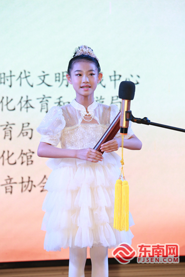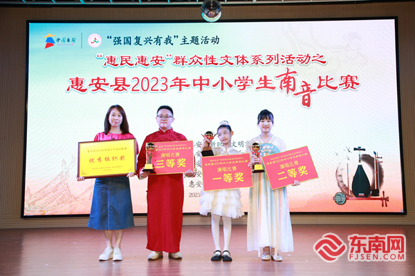 活动现场。受访者 供图 此次比赛由惠安县文化体育和旅游局、惠安县教育局联合举办。比赛分为演唱和演奏两个部分,由惠安实验小学翁子塇同学演唱的《感谢公主》在小学组演唱比赛中荣获一等奖第一名。与此同时,该校曾姝瑜同学演唱的《春光明媚》获二等奖,庄佳濠同学演唱的《帘外雨潺潺》获三等奖。 据悉,南音是中国现存最古老的乐种之一,有“中国音乐史上的活化石”之称,2009年被联合国教科文组织列入人类非物质文化遗产名录。惠安县举办中小学生南音比赛,旨在深入推动南音保护传承,推进传统文化进校园,带动青少年传承非遗技艺、弘扬闽南文化。(张凌)