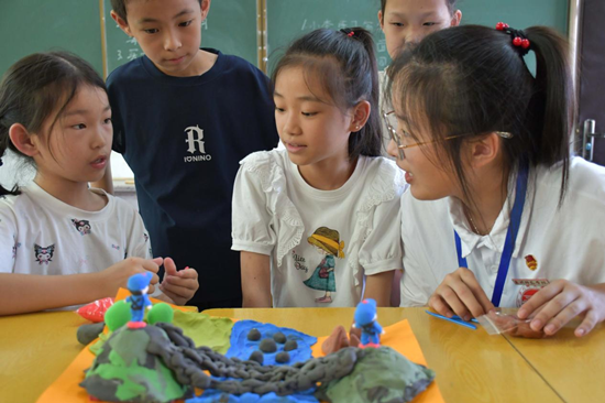 为推动科教融合,实践队利用学院研发的AR红军长征软件,通过扫描“红星照耀中国”地图上的关键地标,带领孩子们亲身体验红军长征的艰难险阻,了解红军革命历史,创新引入红军长征泥塑创作等教学形式,深化学生对红色思政文化的理解与认同。还借助学院研发的AR虚拟簪花、AR真武庙导览软件,将文化遗产以全新方式呈现,带领孩子们云体验闽南地区传统簪花艺术,参观真武庙古迹遗址,让孩子们在虚拟与现实的交融中感受历史文化的厚重。