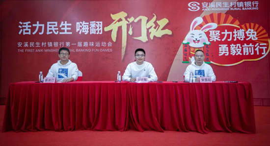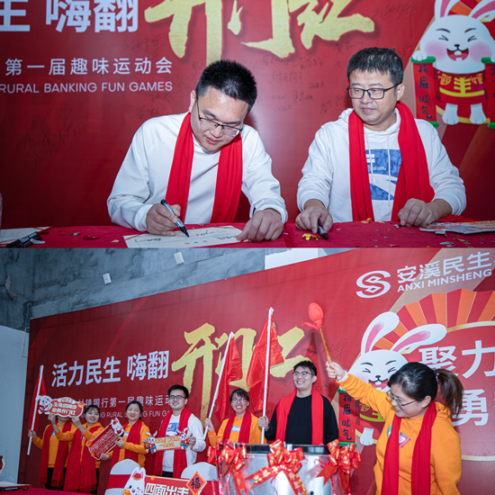 大展鸿“兔”,赢在开门。近日,安溪民生村镇银行隆重启动“聚力搏兔 勇毅前行”开门红誓师大会,全面吹响2023年首战号角,全行近60名员工参加此次活动。 活动以别开生面的趣味运动会拉开帷幕,全体员工用活力奔放、激情昂扬的入场式展现了安溪民生村镇人务实奋斗、永不言弃、勇争第一的拼搏精神。活动现场,各机构负责人擂响大鼓超额加领“开门红”任务指标,鼓声振振,催人奋进,必胜的信心充满全场。