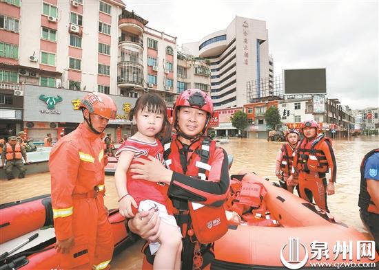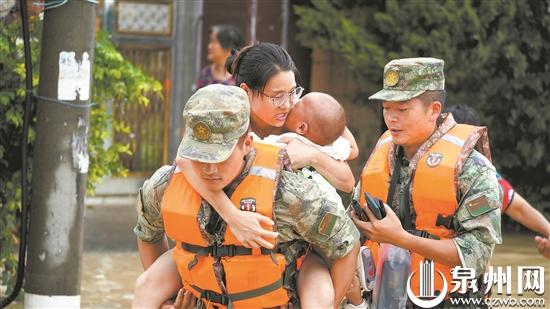 7月29日清晨,第73集团军73653部队接到驻地政府应急支援请求,奔赴南安多地开展群众转移、物资抢救等任务。(潘登 飞龙劲旅 摄) 群众受困 救人兼送物资 “能载我一程吗?我想给我儿子一家送水和食物。”陈老伯对救援队员请求道。下午2点45分,记者跟随陈老伯,一起乘坐蓝天救援队的皮筏艇深入镇区。沿途,可见不少轿车遭受“灭顶之灾”,仅能看到车顶露在水面。“我儿子、儿媳和3个孩子被困,家里吃的不多了,又停水,我着急啊!”皮筏艇行驶到他儿子家附近后,救援队员跳入水中,水深至大腿处。陈老伯的儿子通过一条绳子将物资拉到2楼阳台。