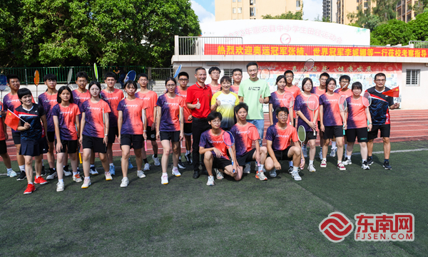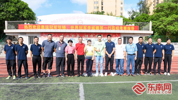 两位世界冠军与师生代表合影。邓文祥 摄 据介绍,惠安嘉惠中学始办于1997年,是由福建省政协原副主席、泉州市政府原市长陈荣春引荐,著名爱国港胞李嘉诚先生捐资兴建的一所公办完全中学。学校始终秉承“以人为本,和谐发展”的办学思想,把体育特色作为学校品牌之一,逐渐形成了以射箭、田径、篮球、足球为特色的体育特色学校。办学以来,学校先后被评为全国射箭重点学校,福建省首批中学田径、篮球体育特色学校与传统体育项目学校,全国青少年校园篮球特色学校,全国青少年校园足球特色学校。学校在县级以上的各类体育比赛项目中累计获得两千多人次的奖项,不断为省市少体校、上海体育大学、福建师范大学等各类高等院校输送体育人才。
