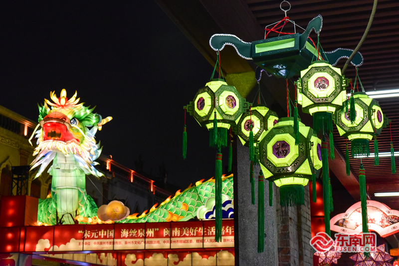 金鱼巷巷口展出大型国潮龙灯—— “龙鲤鲤大青龙”和花灯相得益彰。东南网记者 林婕 摄