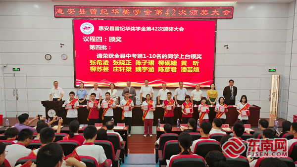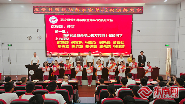 颁奖仪式现场。东南网记者 林杰 摄 东南网8月12日讯(本网记者 林杰)8月12日,曾纪华奖学金第42次颁奖典礼如期在惠安一中举行。曾纪华奖学金委员会代表、惠安县相关部门领导、获奖学校师生代表等到场参加活动。 今年曾纪华奖学金共颁发19.75万元奖学金,奖励了50名2024届优秀毕业生,其中高考学子30名,中考学子20名。获奖学生代表、现已被清华大学录取的惠安一中高三毕业生赵新颖同学向曾纪华奖学金委员会及相关部门表示感谢,她说,曾纪华老先生乐善好施、无私奉献的精神激励着一代代惠安学子,鼓舞着我们不断成长,奋发有为。我们将不忘来时路,在不远的将来,为家乡的各项事业作贡献。