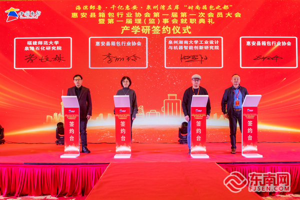 为惠安县箱包行业协会会长李志坚授牌。邓文祥 摄 据介绍,惠安的箱包产业形成了集原材料供应、箱包皮具及配件生产销售于一体的产业体系,现有规上企业39家,出口企业31家,年产值突破52亿元,税收超百万企业30多家,年纳税近亿元,产品远销欧美、中东等30多个国家和地区,出口份额占泉州市10%,是全省全市重要的箱包生产基地。 会议现场,还举行了金融授信仪式、产学研协议签约仪式、品牌箱包走秀活动等。