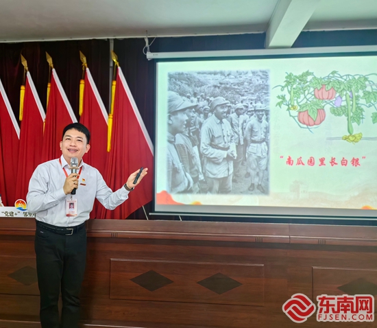 黎明职业大学教师蔡君雄在现场宣讲。谢吉柳 供图 晋江市英林英埔中心小学教师柯远峰的《百两黄金借还记》,将1948年中共泉州中心县委向草庵住持广空法师借还百两黄金的故事娓娓道来,让在场党员们充分感受到“一诺千金”践行的是“全心全意为人民服务”的不变宗旨;黎明职业大学教师蔡君雄带来的《红军不拿群众一针一线》,以南瓜蒂上用红布扎着的白银为切入点,生动诠释了人民军队纪律严明、清正廉洁的作风,深刻阐释了这一优良传统与当下中央八项规定精神的紧密联系和一脉相承;安溪县官桥镇人民政府梁小素带来的《让茶香飘向更远的地方》,讲述了退役军人温文溪如何以“褪戎装不褪色”的赤诚,在茶乡青山间书写乡村振兴篇章,让党员们深刻感悟“为民服务”的初心使命。 |