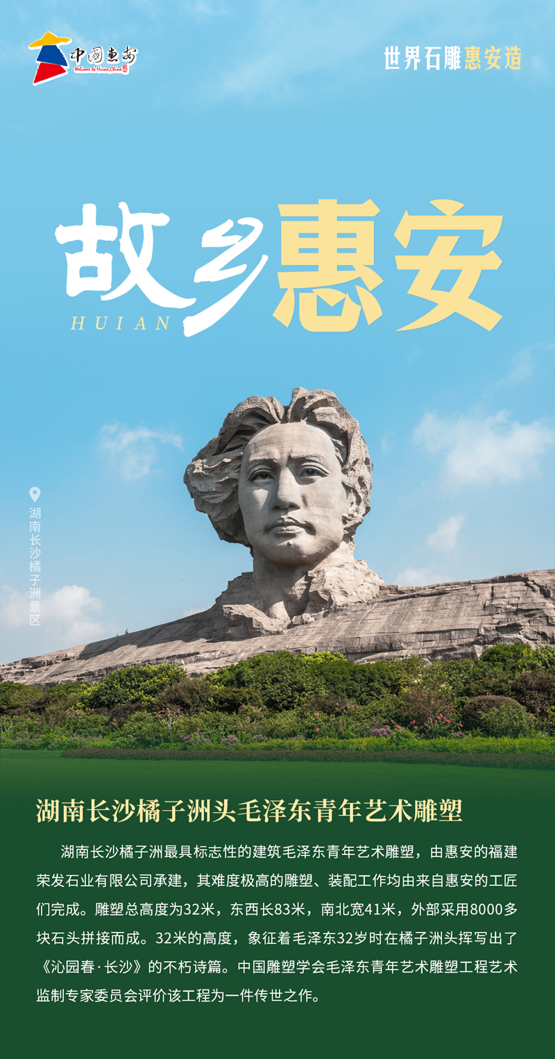例如,在设计制作“湖南长沙橘子洲头毛泽东青年艺术雕塑”海报时,设计组数易其稿,最终选定了以这张正面仰拍照片为底图。图中的毛主席目光深邃,直视前方,突出表现了伟人青年时代胸怀大志、风华正茂的气概,海报的文字内容也与橘子洲自然环境完美融合。整张海报呈现出一种有秩序的韵律美,以强烈的视觉效果和艺术感染力充分展现出惠安雕刻的非凡技艺。