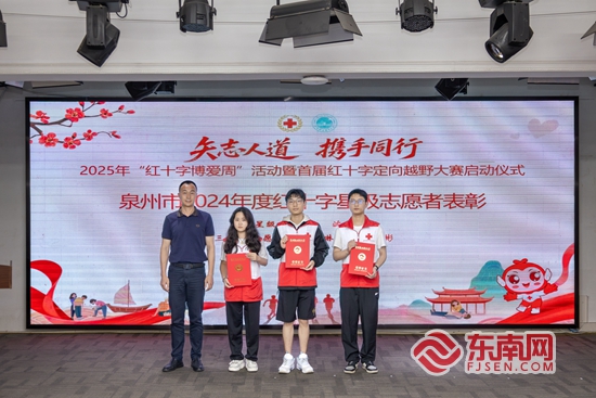 泉州市红十字会党组成员、专职副会长陈飞星为荣获2024年泉州市红十字四星级志愿者、三星级志愿者颁发荣誉证书。学校 供图