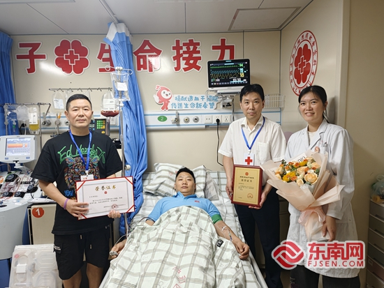 为王元福颁发证书。福建省红十字会 供图 东南网5月31日讯(本网记者 林婕)5月30日,在欢度端午之前,来自泉州的“80后”王元福成功捐献造血干细胞,为素不相识的血液病患者送去了重生的希望,他由此成为福建省第513例、泉州市第49例、晋江市第13例非血缘造血干细胞捐献者,用大爱之举诠释了“人道、博爱、奉献”的红十字精神。 “80后”王元福是贵州人,在晋江工作了15年,早已把泉州当成了自己的第二故乡。2016年,王元福第一次参加无偿献血,从此基本保持着“一年一献”的频率,默默地奉献爱心。2022年6月的一天,王元福又去献血点献血,工作人员向他介绍了造血干细胞捐献。“当工作人员问我要不要加入中华骨髓库,我也没多想就同意了。” 2024年12月,王元福接到泉州红十字会的电话。“得知自己和患者初步配型成功,心里挺激动的,又可以献一份爱心了。”于是,他果断答应了捐献。 此后,他一直关注着造血干细胞捐献。“平时经常收到中华骨髓库给我发的信息,有很多的相关知识普及,我也会向家人、朋友宣传。”身边人从最初的不理解,到逐渐被他的热情所感染,纷纷支持他的善举。他深知,自己的一次捐献,可能就能拯救一个鲜活的生命,拯救一个濒临绝望的家庭,也可能带动更多人参与这项生命互助的光荣事业。 |
