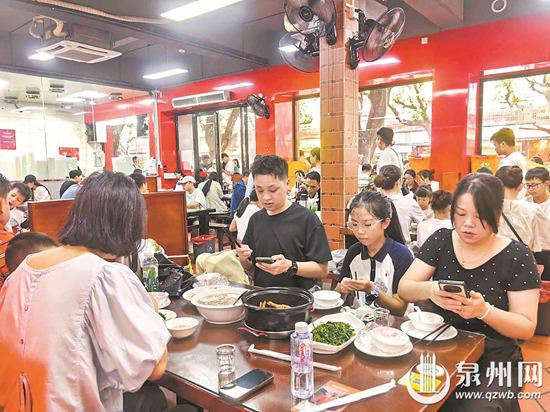 佳朋满座 味道鲜美的海蛎煎、口感丰富的面线糊、香醇滋补的牛排、外焦里嫩的姜母鸭……这个国庆假期,泉州凭借独特的美食文化,吸引了来自天南地北的游客。他们在升腾的烟火气中,品味着泉州人三餐四季里的生动日常,由衷赞叹“泉州真好呷”。 寻味而至 特色美食受热捧 一碗热腾腾的面线糊,是泉州人一天美好生活的开始。上午9点,老城区百源路一家老字号面线糊店内,食客排着长队,点餐声此起彼伏。虾仁、醋肉、大肠、海蛎……琳琅满目的配料整齐摆放,老板熟练地将选好的食材加入碗中,浇上滚烫鲜美的面线糊,再撒上胡椒粉、葱花与香菜,一碗色香味俱全的面线糊便制作完成。“味道太鲜美了,一碗下肚,整个人都舒服了不少。”不少游客感慨道。 “老板,来份海蛎煎!”“土笋冻也来一份……”上午10点,西街与中山路上已是熙熙攘攘,不少游客携家带口边逛边吃。海蛎煎、土笋冻、芋头饼、浮粿、四果汤……这里汇聚了众多泉州本土小吃,每家店门前都围着不少游客,迎面走来的游客手中也大多拿着茶饮或小吃。“这个芋头饼太好吃了,你们快尝尝!”来自广州的李女士咬了一口刚出锅的芋头饼,就被外酥里嫩的口感惊艳到,立刻与家人分享。还没细细品味完,她的目光又被隔壁的四果汤吸引了过去。 临近中午,新华北路飘来阵阵姜母鸭的香气,游客纷纷循香而至。走进一家老字号店铺,一锅锅姜母鸭在砂锅中滋滋作响,金黄的姜片与热油包裹着鲜嫩的鸭肉,散发出浓郁诱人的香味。店内早已坐满了食客,长沙游客连先生一家三口大快朵颐,连连称赞道:“鸭肉鲜嫩入味,不油不腻,真是让人胃口大开!” |