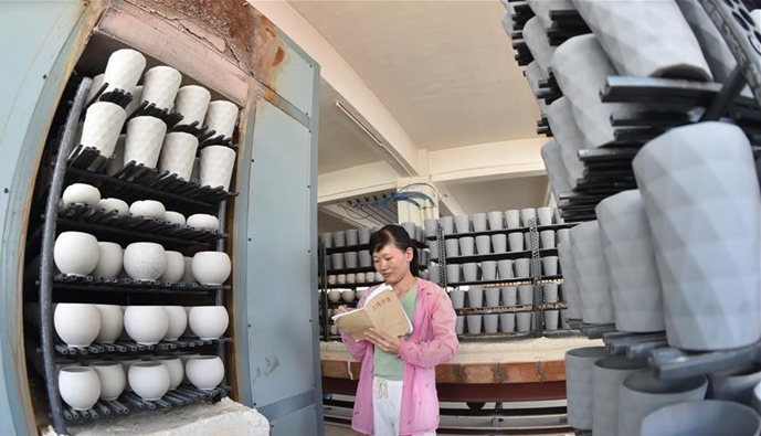 9月26日,在福建省泉州市德化县中昱陶瓷厂,工人在新型节能电热隧道窑前对一批准备出口的陶瓷花盆进行登记。该企业与当地供电公司共同研究推出了采用新型电热窑炉发热元件的电窑炉,可节约生产成本约26%。 福建省泉州市德化县是我国著名的陶瓷生产基地,多年来,该县大力推广陶瓷循环化改造,通过国家电网能源替代项目,支持企业以电代柴对窑炉进行技术改造,在转型升级、降低损耗的同时走上绿色发展之路。据统计,截至今年8月底,该县70%的陶瓷企业已经实现以电烧瓷,累计减少水土流失面积5万亩,减少二氧化碳排放约10万吨,被列入国家循环经济典型模式示范县。 新华社记者宋为伟摄 9月26日,在福建省泉州市德化县顺美陶瓷厂,工作人员在电热隧道窑前操控流水线。。新华社记者宋为伟摄 9月26日,在福建省泉州市德化县顺美陶瓷厂,工人准备将一批马克杯放入电热隧道窑流水线。新华社记者宋为伟摄
