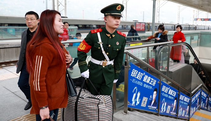 执勤官兵维持上车秩序,积极帮助旅客登车 朱志浩 摄 |
