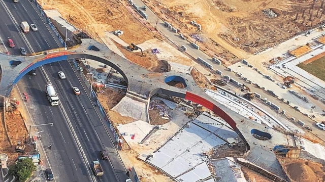 昨日,在市区北滨江公园浦西园人行天桥施工现场,工人们正在抓紧施工。目前,天桥主体已经成型,柔和的曲线异形钢箱梁形成一条“飘带”横跨江滨路。据悉,浦西园人行天桥连接浦西城市综合体和北滨江公园浦西园,总长150米,将为市民休闲生活提供安全便捷通道,建设后期还将在桥上规划小广场和观景天台,设置多处人行上下通道,预计明年春节前全面完工。(陈晓东 文/图)