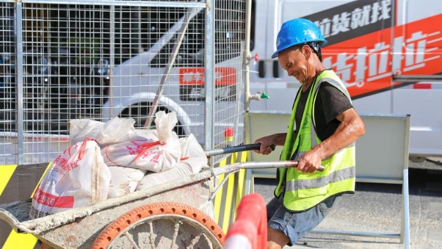为保证施工进度稳步推进,几名建筑工人奋战在高温下,默默坚守着工作岗位。东南网记者 林婕 摄