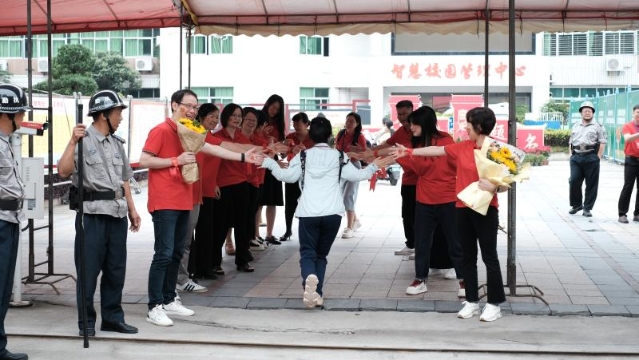 泉州市第九中学考点外,不少家长们在考场外送考等候。林梦琳 摄
